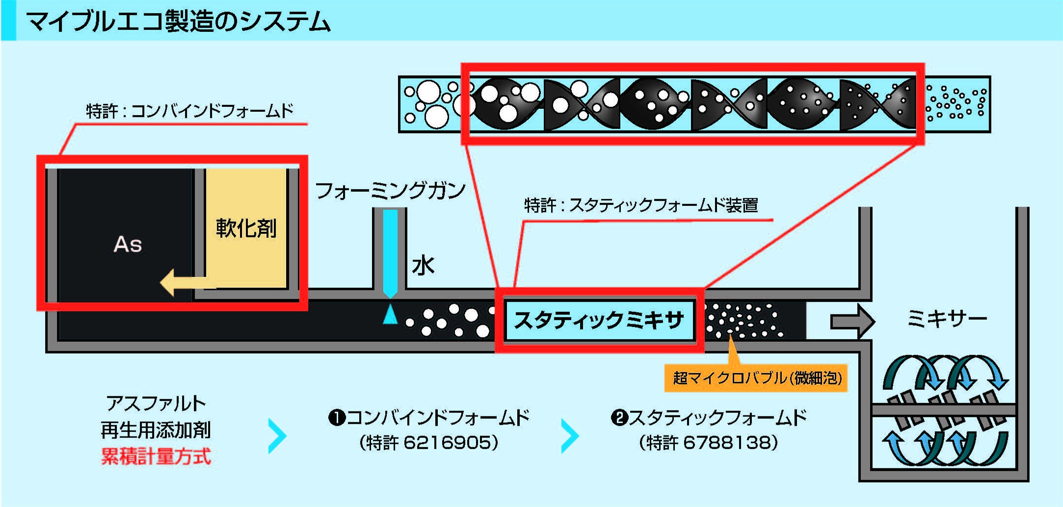 - 専用のフォームド装置を用いて、アスファルト混合物製造時にアスファルトの中に微小な泡を添加する技術です。フォームドのベアリング効果により、温度が低下した時の締固め特性を改善します。
